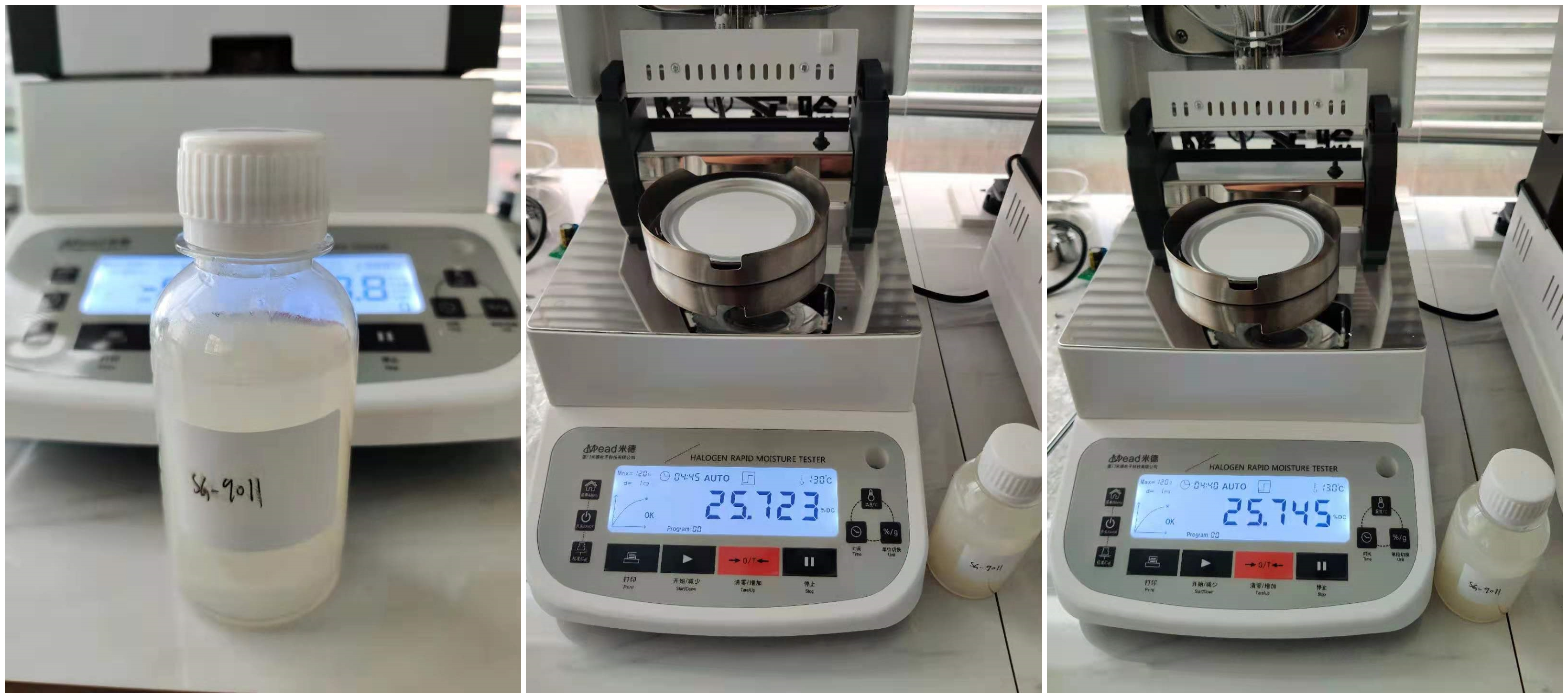 6、做完溶液1的重復性測試后,我們對溶液2進行同樣的操作,重復上述步驟,得出溶液2兩次測試的固含量結(jié)果為25.723%和25.745%,誤差為0.022%。