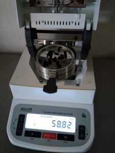測(cè)試話梅干碎:為了使測(cè)試過程中話梅干水分儀將話梅干烘干烘透,我們將話梅干用剪刀剪成碎片,攤成分散狀,以便溫度能滲透進(jìn)去。取3克左右話梅干碎均勻鋪撒在不銹鋼托盤中,用鑷子將話梅干碎平鋪均勻,為使話梅干水分完全烘干并且不變焦,我們將溫度設(shè)置在160℃,按“START”鍵開始測(cè)試,25分04秒后檢測(cè)結(jié)束,檢測(cè)數(shù)據(jù)顯示58.44%;