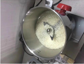 *2、將大米用粉碎機(jī)打成粉末狀,再均勻平鋪在托盤上,擺放時放入約5g左右,切勿用力觸碰樣品托盤。